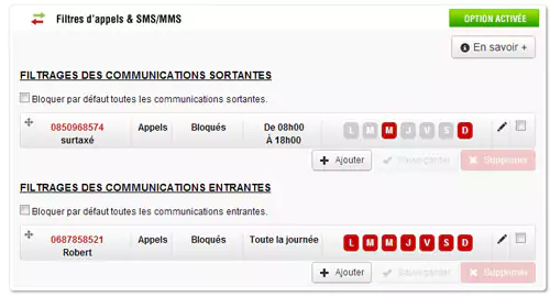Les filtres sont classés en deux catégories : les communications entrantes, et les communications sortantes. Lorsque ce service est désactivé, toutes les réceptions et émissions de communications sont autorisées sur votre ligne. Si vous décidez d’activer ce service, vous pourrez alors filtrer toutes vos communications à votre convenance.