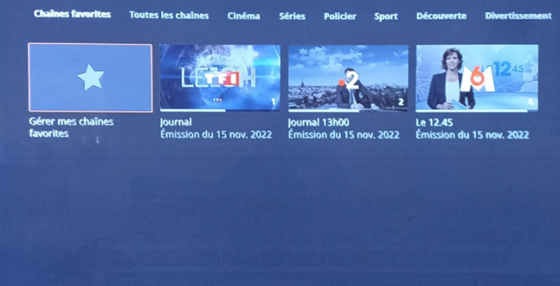 Cette nouvelle fonctionnalité est disponible dans le menu horizontal du haut, et se nomme “chaîne favorites”. En cliquant dessus pour la première fois, vous avez un aperçu des logos de toutes les chaînes, et il suffit de cliquer sur celles que vous souhaitez pour les mettre dans votre beaucoup favoris. Une petite étoile s’affiche alors sur le logo.
