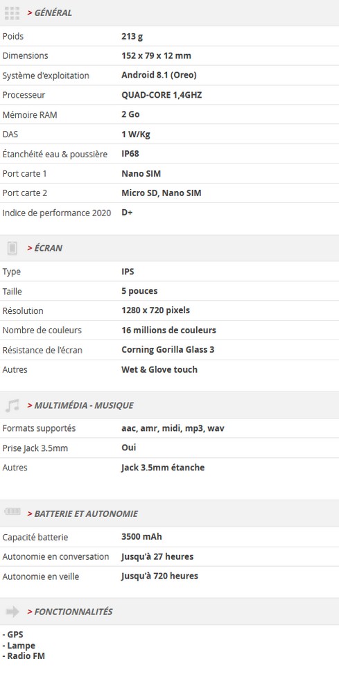 Pensé pour les activités outdoor, le smartphone Crosscall Core-X3 résiste à la pluie, à la neige, au vent et à la poussière. Côté caractéristiques techniques, il propose notamment un processeur quad-core 1,4 GHz avec 2 Go de RAM, un écran IPS 5 pouces HD, le mini-jack, un stockage 16 Go extensible par MicroSD, des capteurs photo 5 et 8 Mégapixels et une batterie 3 500 mAh.