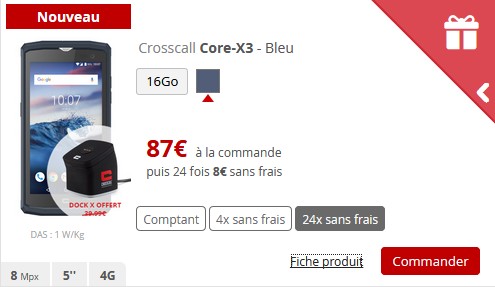 Il s’agit du smartphone Crosscall Core-X3. Celui-ci est proposé à 279 euros au comptant, mais également en 4 fois sans frais (72 euros puis 3 fois 69 euros) ou 24 fois sans frais (87 euros à la commande, puis 24 fois 8 euros). Notez que l’accessoire X Dock, d’une valeur de 39,99 euros, est offert.