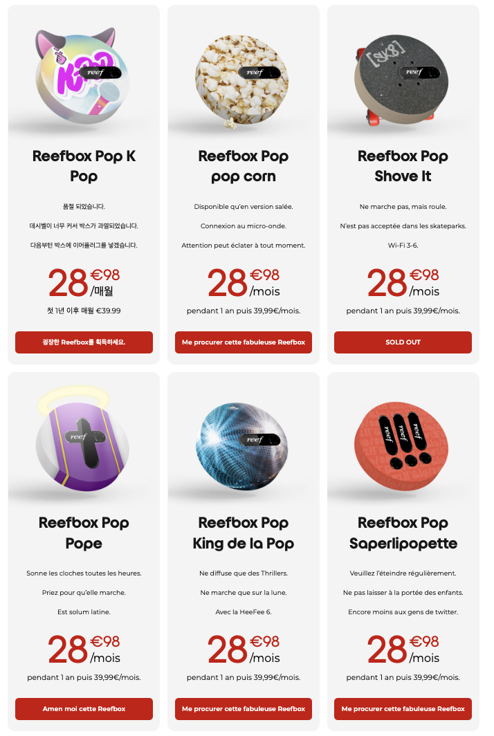 Plus de deux ans plus tard, silence radio, enfin presque. Il faut se tourner aujourd’hui vers Reef pour avoir un aperçu de ce que cela pourrait donner. Le “concurrent créé par Free pour écraser Free”, vient de lancer de manière factice sa Reefbox Pop, à 1€ de moins la première année que la Freebox Pop. Mais pour se démarquer, le faux opérateur, nouvel outil publicitaire de Free, met le paquet visuellement en proposant pas moins de 6 versions différentes de la petite box vitaminée du premier recruteur du moment sur le fixe. Les habillages sont alléchants, de quoi donner envie d’une Reefbox Pop dans son salon. Il y en a pour tous les goûts, Reefbox Pop “K Pop” pour les férus du genre musical sud-coréen, “Pop Corn”, “Pop Shove it” pour les skaters, “Pope” (pape), “King de la Pop”, et “Saperlipopette”. Quelle est votre préférée ?