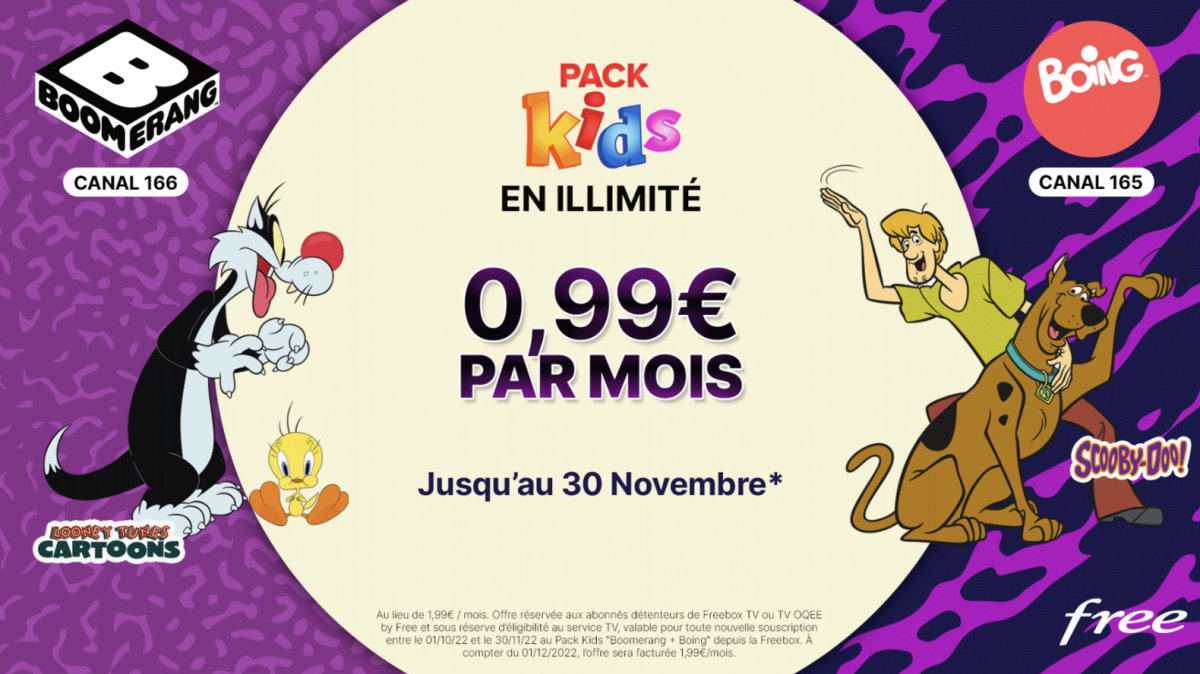 Pour occuper les tout-petits, vous pouvez bénéficier d’une promotion sur le Pack Kids. Comprenant une sélection des meilleurs chaînes pour enfants comme Boomerang (144), Bommerang+1 (145) , Boing (153) mais aussi les services Boomerang Illimité (166) et Boing Illimité (165), ce bouquet sera facturé 0,99€/mois, au lieu de 1,99€ jusqu’au 30 novembre inclus.