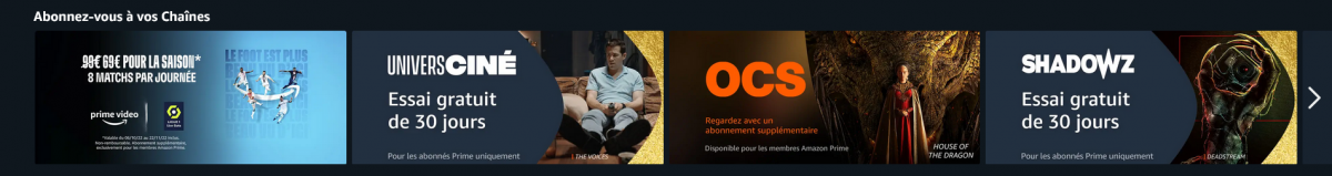 Beaucoup de services SVOD sont disponibles sur les Freebox et souvent des périodes d’essai sont offerts afin de découvrir et se familiariser. Cela se passe Amazon Channels (Prime Video) où sont proposés une semaine à 1 mois offert pour une très large sélection de services. Il est par exemple possible d’essayer Madelen (Ina) Shadowz, Filmo TV, MUBI, Benshi, Starzplay, Univers Ciné, Hayu, Kitchen Mania, Outbuster, Geo television, Queerscreen, Spicee et bien d’autres gratuitement.