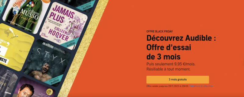 Habituellement proposé avec 1 mois d’essai, Audible, l’application qui permet aux utilisateurs d’écouter des livres et autres contenus audio d’Amazon bénéficie de trois mois d’essais offerts à l’occasion du Black Friday. Jusqu’au 28 novembre prochain, “en plus des thrillers, des livres de non-fiction, des best-sellers bien connus et des titres Audible exclusifs, notre vente Black Friday vous donne également un accès illimité à des podcasts Audible Original – des titres que vous ne pouvez entendre nulle part ailleurs. Choisissez à partir d’un énorme catalogue chaque mois plus de 500 000 titres et laissez-vous inspirer par des voix et des expériences d’écoute uniques”, annonce le groupe de Jeff Bezos.