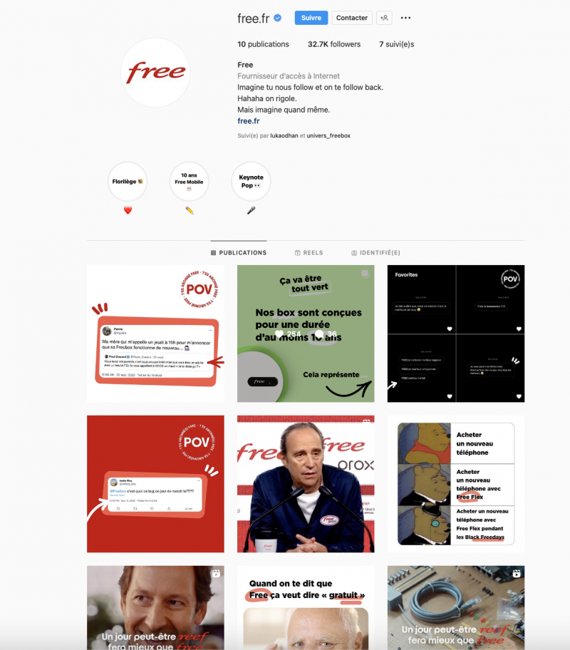 Free a récemment décidé de repartir d’une page blanche sur Instagram afin de proposer de nouveaux contenus à ses 32 700 abonnés. On y retrouve notamment des pubs de Reef, le faux opérateur créé par Free pour l’écraser mais aussi la conférence d’avant lancement avec coach Niel plus cocasse que jamais lorsqu’il s’agit de présenter sa team Free Proxi.