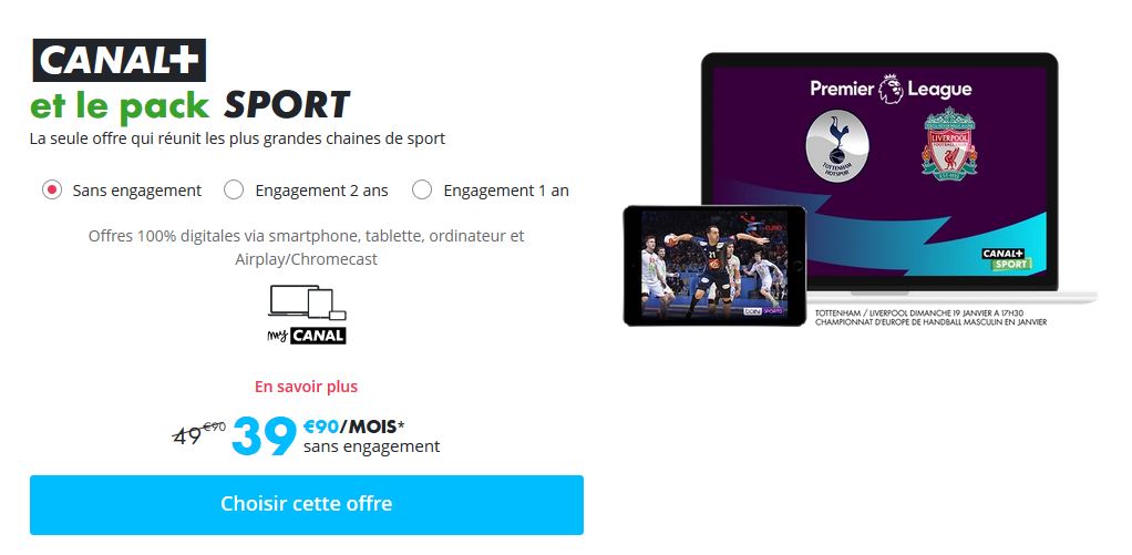 Initialement proposé à un tarif promotionnel de 15€/mois pour une nouvelle souscription, le pack Sport de Canal+ passe quant à lui à 20€/mois. Pour une offre avec engagement d’un an, le tarif passe à 25€/mois.