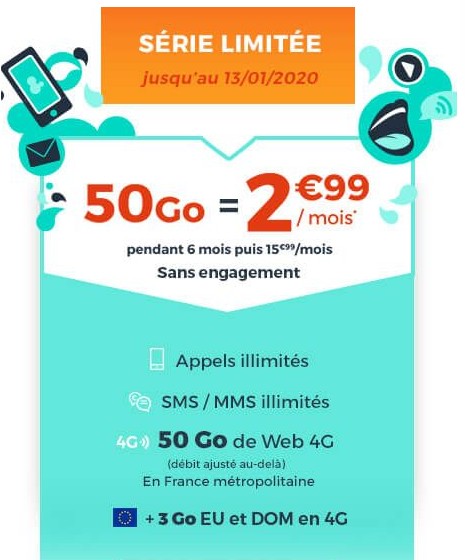 Sans engagement, le forfait en question inclut les appels, SMS et MMS en illimité, ainsi qu’une enveloppe data de 50 Go avec des débits 3G/4G (selon la couverture). Il est utilisable depuis l’étranger, avec une enveloppe supplémentaire de 3 Go pour l’Europe et les DOM.