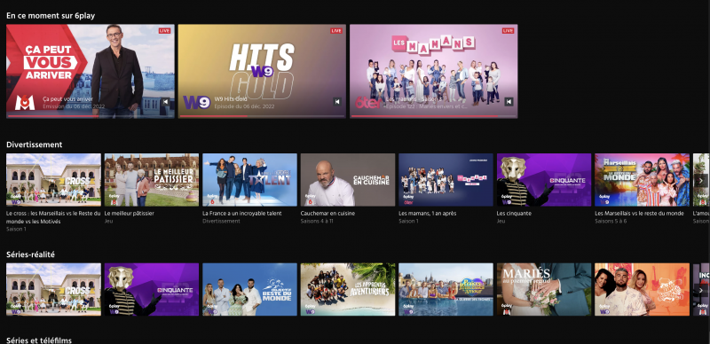 Y figurent notamment l’accès aux programmes en direct des trois chaînes mais aussi une kyrielle de catégories regroupant par thématique leurs contenus comme “Divertissement”, “Séries-réalité”, “Séries et téléfilms”, “Cinéma”, “Info et société”, “Sport”, et “Jeunesse”.