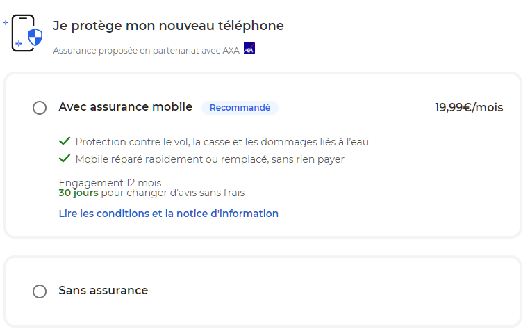 Une fois la commande validée, vous serez ainsi assuré avec un engagement de 12 mois contre la vol, la casse ou les dommages liés à l’eau. Une documentation vous est présentée pour connaître en détail les tenants et aboutissants de votre assurance.