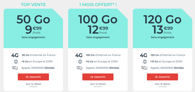 En parallèle, Cdiscount Mobile propose un forfait 50 Go sans engagement à 9,99 euros par mois et un autre forfait 130 Go à 13,99 euros par mois. Les deux forfait incluent également les appels, SMS et MMS en illimité, ainsi que respectivement 9 et 13 Go depuis l’Europe et les DOM.