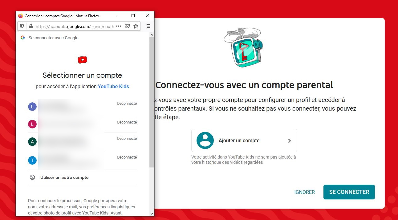 Il faudra ensuite saisir votre année de naissance. Vous accéderez après cela à une vidéo présentant le service, avec possibilité d’afficher uniquement le texte. Puis, il faudra enfin sélectionner le compte Google que vous souhaitez lier à YouTube Kids.