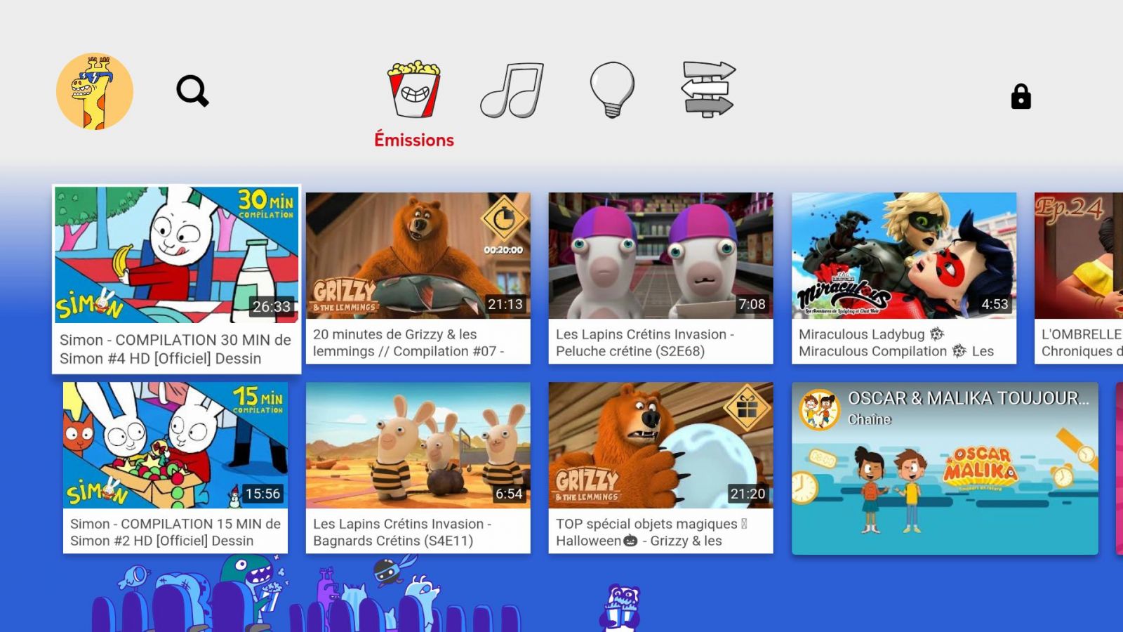 L’interface est très simple, logique puisqu’un enfant doit pouvoir s’y retrouver facilement. Vous arriverez directement sur la page “émission”, proposant du contenu dédié à vos petits. (il s’agit ici du contenu proposé pour la catégorie 5-7 ans)