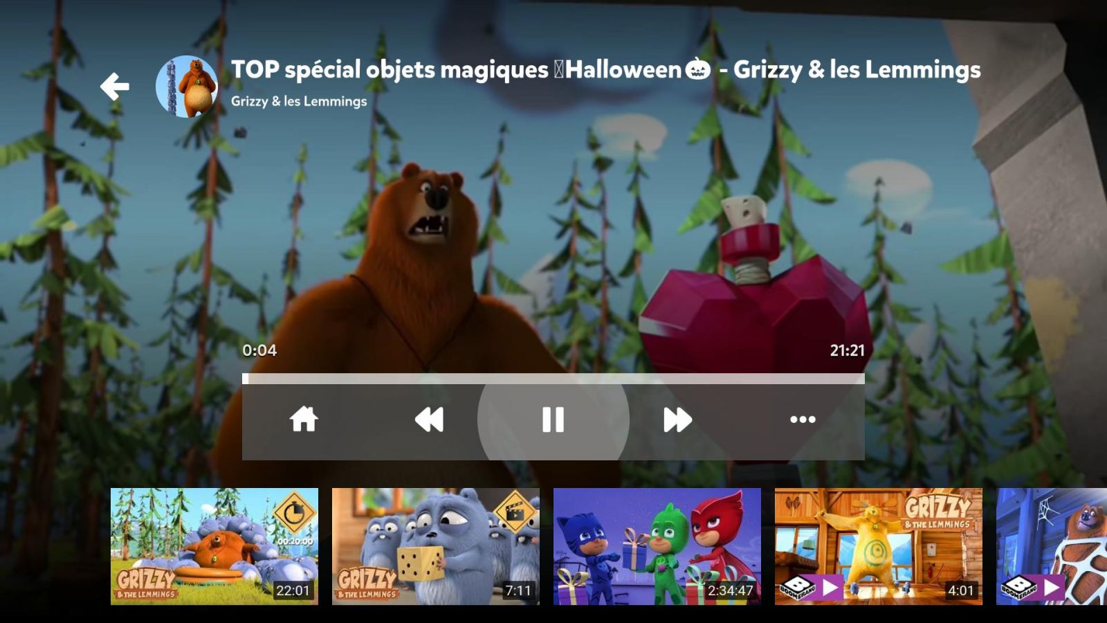 On notera également la présence du bouton de recherche, si vous l’avez activé précédemment. De même, vous pourrez changer de profil directement en cliquant sur l’icône au début pour passer d’un enfant à l’autre par exemple. Passons maintenant au lecteur de l’application. L’interface rappellera YouTube aux habitués, bien que le lecteur soit très simplifié. Pas de gestion de la qualité, simplement des boutons d’avance rapide et de pause. En dessous de la barre de navigation, on trouve plusieurs suggestions de vidéos en relation avec le contenu regardé.