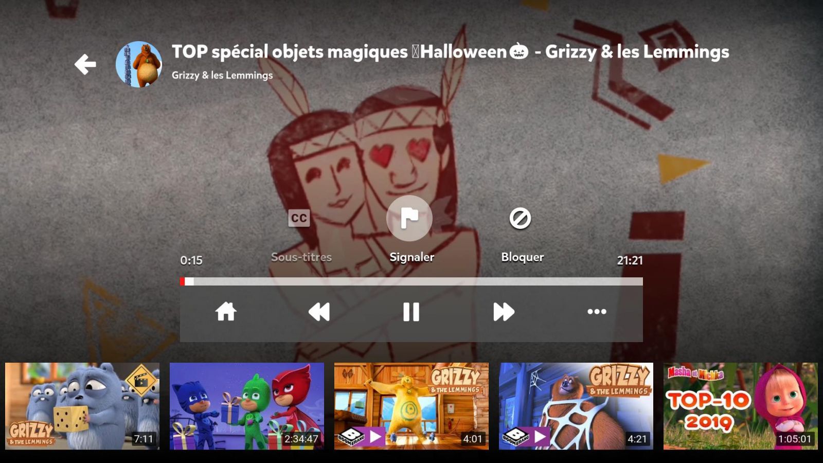 Le petit bouton “…” du lecteur permettra aux parents de gérer quelques paramètres : activer des sous-titres si le contenu en propose, mais surtout signaler un contenu choquant ou le bloquer s’il ne convient pas aux programmes que vous voulez rendre accessible à votre tout petit.