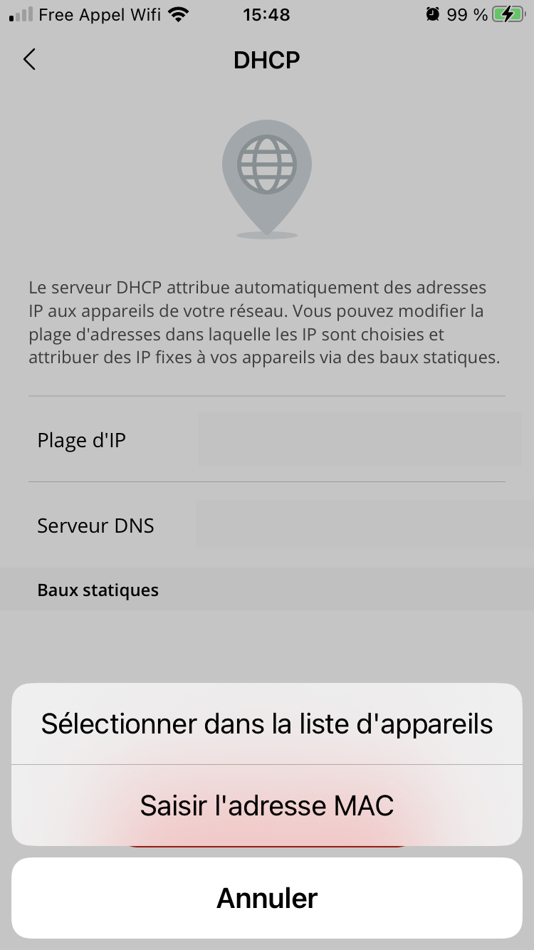 Autre évolution, il est désormais possible de modifier la plage d’adresses dans laquelle les IP sont choisies par votre DHCP et d’attribuer vos IPfixes à vos appareils via des baux statiques. Il vous sera demandé de faire une sélection dans la liste des appareils ou de saisir une adresse MAC.