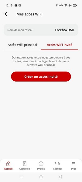 Dans le cas du Wi-Fi invité, il va d’abord falloir créer son accès dédié, en tapotant sur le bouton rouge “Créer un accès invité”.