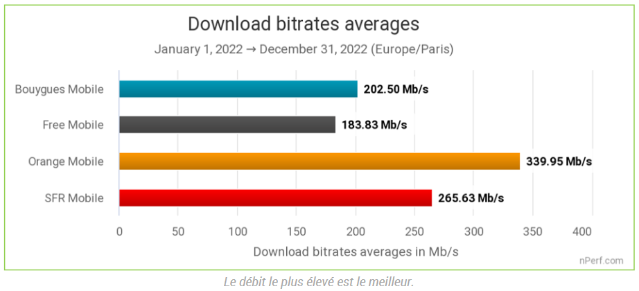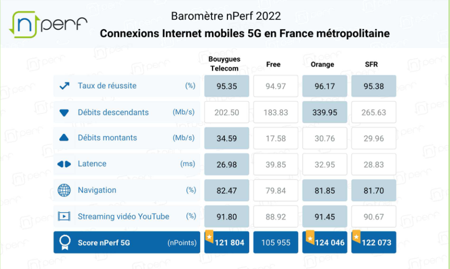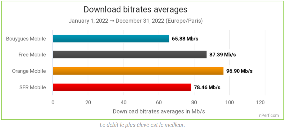 L’opérateur historique conserve sa place sur le trône sur cinq des six indicateurs mis en avant par nPerf dans son étude, dont évidemment les débits montants et descendants en combinant les tests 2G/3G/4G et 5G. Les abonnés de l’opérateur historique accèdent ainsi en moyenne à un téléchargement à 96.90 Mbps . Sur les téléchargements, Free Mobile pour sa part conserve son statut de challenger avec 87.39 Mbps en download en moyenne devant SFR (78.46 Mbps) et Bouygues Telecom (65.88 Mbps).
