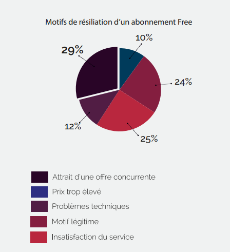 Cela concerne à la fois la résiliation de Freebox que de forfaits mobile. Il en ressort que le prix (10 %) n’est pas déterminant comme motif de résiliation, et les problèmes techniques (12 %) un peu plus élevés que chez les autres opérateurs. Par contre, l’insatisfaction du service, à 25 %, est particulièrement élevée. A noter que contrairement aux opérateurs (Orange, SFR et Bouygues Télécom), il n’y pas de résiliation pour cause de fin d’engagement, puisque celui-ci n’existe pas chez Free, que ce soit sur le fixe ou le mobile. L’opérateur de Xavier Niel a cependant introduit cette notion dans ces dernières Ventes Privées, avec un smartphone offert.