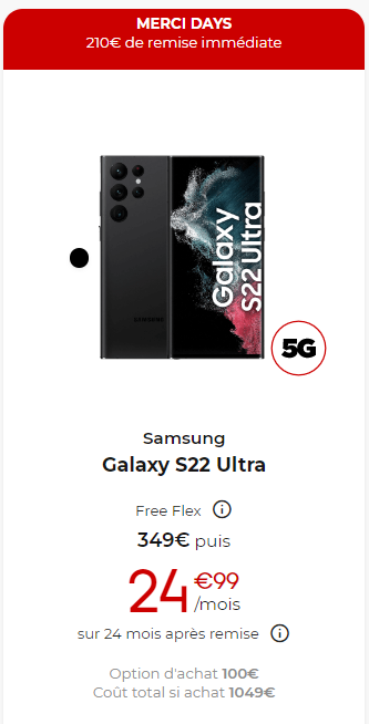 Avec Free Flex : sur une durée de 24 mois pour ce mobile, le premier paiement sera de 899€ (au lieu de 1099€) puis 24 loyers suivants de 24.99€/mois. A l’issue des 24 mois, vous avez le choix entre restituer votre mobile ou l’acquérir en versant le montant de l’option d’achat de 100€. Vient en sus le bonus de reprise de 100€