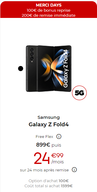 En paiement comptant, ce smartphone passe donc de 1799€ à 1599€. A cela s’ajoute un bonus de reprise de 100€ (soit 1499€ au final)
