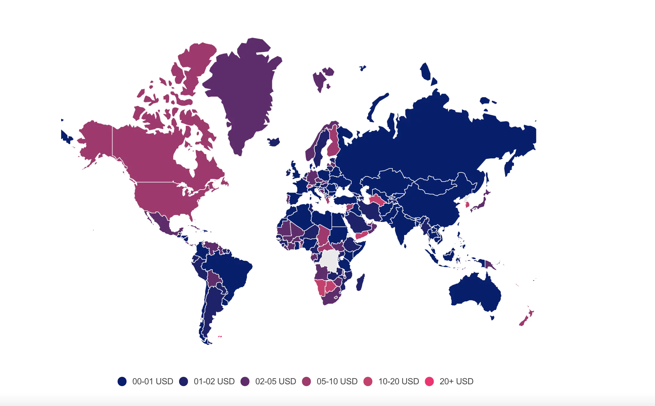 En bas du classement, les mauvais élèves sont notamment Saint-Hélène (41€/Go) et les Îles Malouines (38,45€/Go). De leur côté, le Canada et les USA déçoivent, classés respectivement à la 204e place (5,94€/Go) et au 202e rang (5,62€/Go).