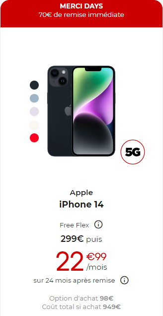 Le second smartphone concerné est l’iPhone 14 qui bénéficie également d’une remise de 70€.