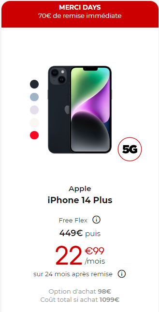 Le premier smartphone concerné est l’iPhone 14 Plus qui bénéficie d’une remise de 70€.