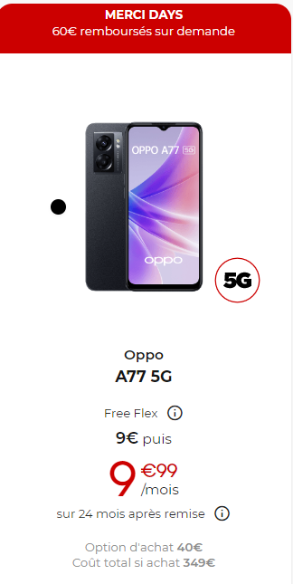Le smartphone concerné est l’Oppo A77 5G qui bénéficie d’une ODR de 60€. Il est disponible avec Free Flex : sur une durée de 24 mois pour ce mobile, le premier paiement sera de 69€ (soit 9€ en déduisant l’ODR) puis 24 loyers suivants de 9.99€/mois. A l’issue des 24 mois, vous avez le choix entre restituer votre mobile ou l’acquérir en versant le montant de l’option d’achat de 40€.