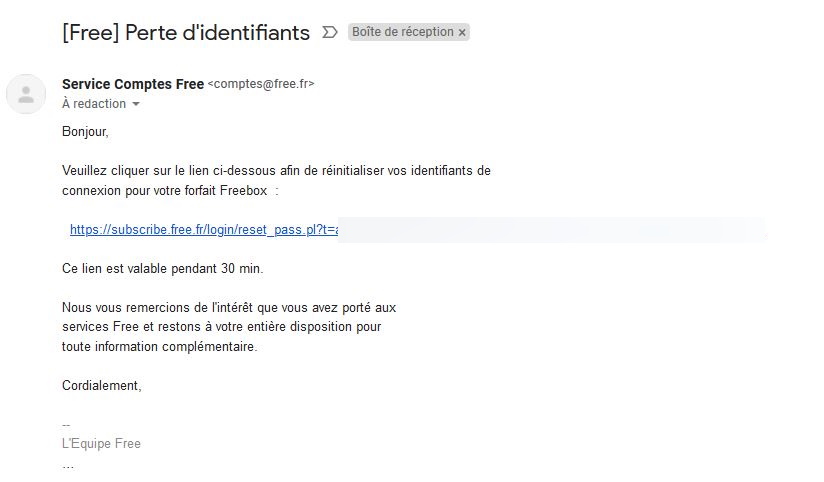 Le mot de passe et les identifiants étaient affichés clairement et c’était un problème au niveau de la sécurité. Cela voulait dire qu’une personne malintentionnée pouvait directement accéder à ces mots de passe si elle pénétrait la base de donnée de Free. L’opérateur a donc changé la donne, en chiffrant les mots de passe dans sa base de données, ce qui change également la manière de récupérer son mot de passe. Dorénavant, un lien unique est envoyé à l’abonné, valable 30 minutes de manière à ce que ce dernier puisse changer son mot de passe.