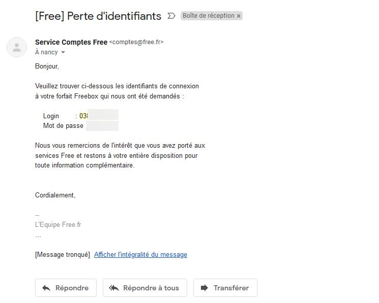 L’opérateur de Xavier Niel a enfin chiffré ses mots de passes pour accéder à l’espace abonné Freebox. En effet, auparavant, un abonné ayant oublié son mot de passe et cliquant sur le lien pour le récupérer recevait l’ensemble de ses identifiants en clair par mail, comme ci dessous.