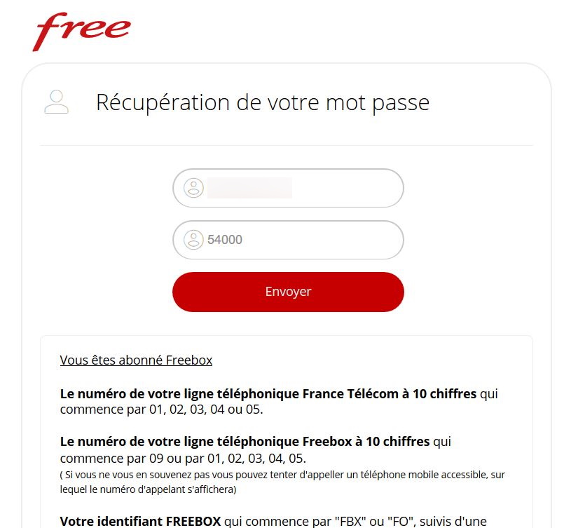 Une fois que vous avez cliqué sur ce bouton, vous êtes redirigés vers une page demandant votre identifiant Freebox ainsi que votre code postal. A noter que vous pouvez bien sûr utiliser les diverses formes d’identifiants proposés : votre numéro de ligne, tant Freebox que France Télécom, mais aussi l’identifiant commençant par “FBX” ou “FO”. Les possibilités sont indiquées sur la page. Une fois ces informations saisies, vous pouvez cliquer sur “Envoyer”.