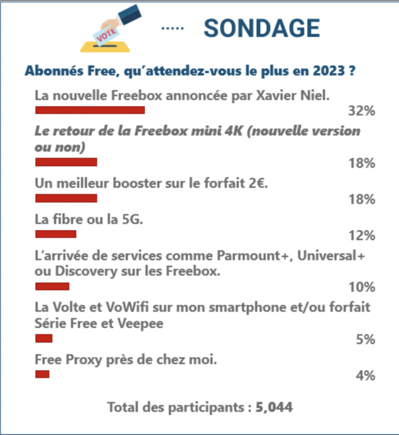 La question a été posée aux abonnés Free du 22 décembre au 19 janvier 2023 : “Qu’attendez-vous le plus en 2023 ?”. Aujourd’hui, Univers Freebox dévoile les résultats de son sondage. Sur les 5044 votants, 32% ont répondu “la nouvelle Freebox annoncée par Xavier Niel”. Lors de la journée des communautés Free qui s’est déroulée fin septembre 2022, le fondateur de Free a révélé son intention de commercialiser une nouvelle génération de box en 2023, probablement lors du second semestre. Si les détails de cette Freebox sont encore inconnus, Free a une idée très claire de ce que sera le produit, quelques questionnement subsistaient alors sur la partie télévision. Cependant, la formule d’une offre avec player devrait être une nouvelle fois privilégiée. L’opérateur estime par ailleurs que le marché va dans le sens de la disparition du décodeur dans les offres télécoms, mais qu’il n’est pas encore assez mature pour cela.