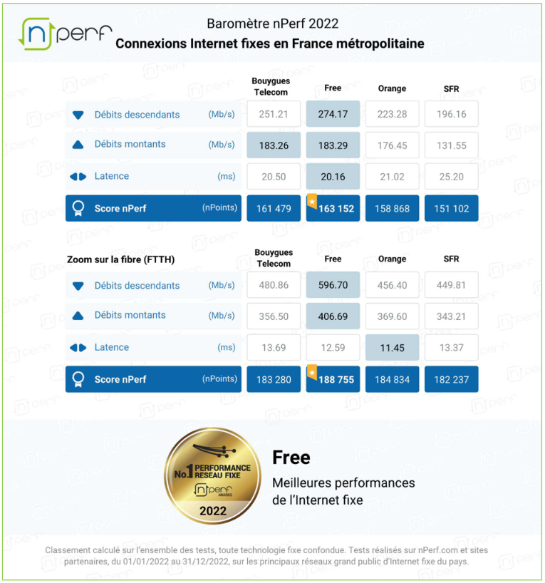 Dans son baromètre annuel des connexion de l’internet fixe, nPerf est sans appel : les abonnés Free ont profité en 2022 des meilleures performances de l’Internet fixe, tant en fibre que toutes technologies confondues.