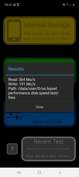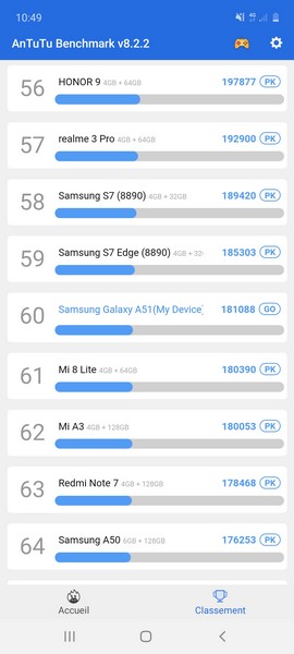 L’outil AnTuTu place le Galaxy A51 entre les Galaxy S7 et Redmi Note 7, tandis que l’utilitaire Disk Speed indique 191 Mo/s en écriture et 364 Mo/s en lecture pour le mémoire de stockage interne. Pas une machine de guerre, mais un smartphone qui offre assez de performances pour couvrir tous les usages.