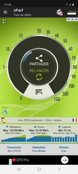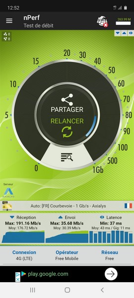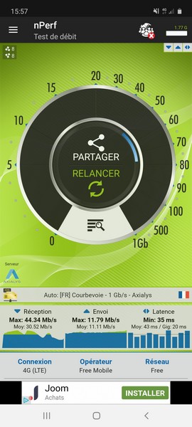 Durant nos tests de débit, nous avons passé à plusieurs reprises les 100 Mbit/s et flirté avec les 200 Mbit/s, en réception en extérieur. Concrètement, nos téléchargements étaient généralement assez rapides en extérieur. Même ceux des jeux Call of Duty Mobile et Asphalt 9 n’ont pas semblé interminables.