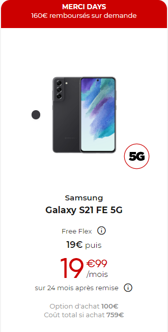 Concrètement, le Samsung Galaxy S21 SE 5G est disponible avec Free Flex : sur une durée de 24 mois pour ce mobile, le premier paiement sera de 179€ (soit 19€ en déduisant l’ODR) puis 24 loyers suivants de 19.99€/mois. A l’issue des 24 mois, vous avez le choix entre restituer votre mobile ou l’acquérir en versant le montant de l’option d’achat de 100€.