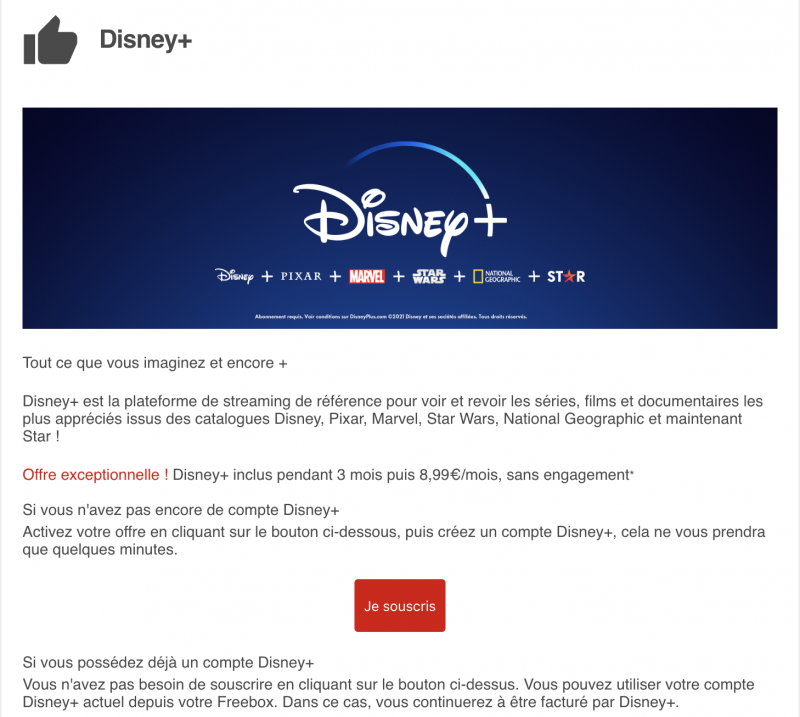 Pour les abonnés actuels, cette offre est accessible sur l’Espace Abonné dans la rubrique Télévision à condition de ne pas être déjà abonnés Disney+ et sous réserve d’une souscription avant le 30 mai prochain. La création d’un compte auprès de Disney+ nécessaire. La résiliation prendra effet à la fin de la période de facturation en cours.