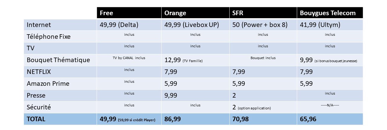 Quel est le prix d’une box à services ? Un internaute s’est posé la question et a réalisé un tableau comparatif, mettant ainsi côte à côte les différentes offres premium de Free, Orange, SFR et Bouygues Telecom, pour comparer la facture finale après avoir souscrit à tous les services inclus dans l’offre Delta. Les prix des offres affichés sur ce tableau sont celles hors période de promotion durant la première année. Le résultat est très parlant : la Freebox Delta est significativement moins chère.