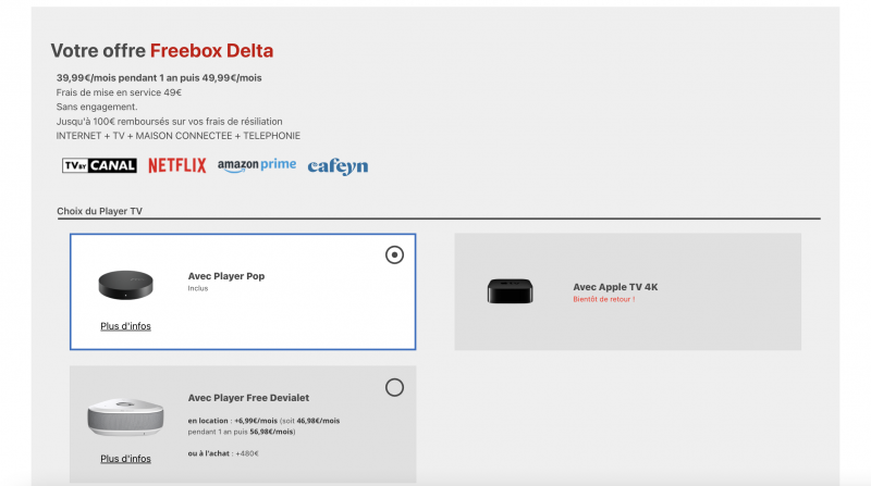 Les nouveaux abonnés Freebox Pop et Delta n’ont plus la possibilité d’opter pour l’Apple TV 4K, idem en multi-TV. Mais un retour est prévu prochainement.