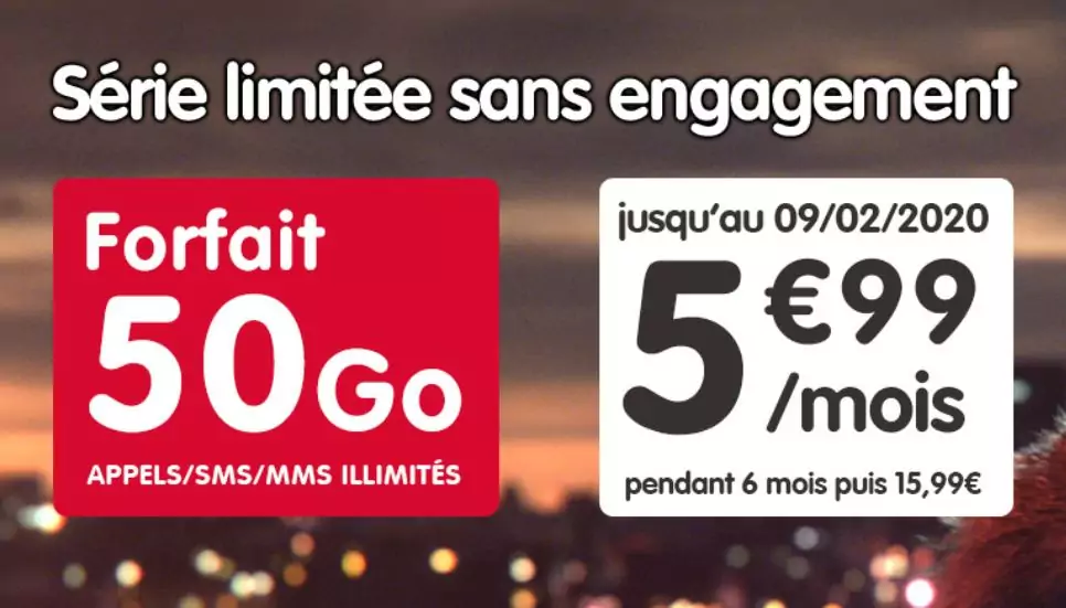 Jusqu’au 9 février prochain prochain, NRJ Mobile propose un forfait mobile sans engagement à prix cassé. Pour 5,99 euros/mois, il inclut les appels, SMS et MMS en illimité, ainsi qu’une enveloppe data de 50 Go en 3G/4G. À noter que le tarif promotionnel est valable durant les 6 premiers mois et que lors de la commande, il faudra compter sur 10€ supplémentaires à payer pour la carte SIM triple découpe. L’offre prend la forme d’une remise de 10€ par mois pendant les six premiers mois, au-delà, le prix repasse à 15,99 euros.