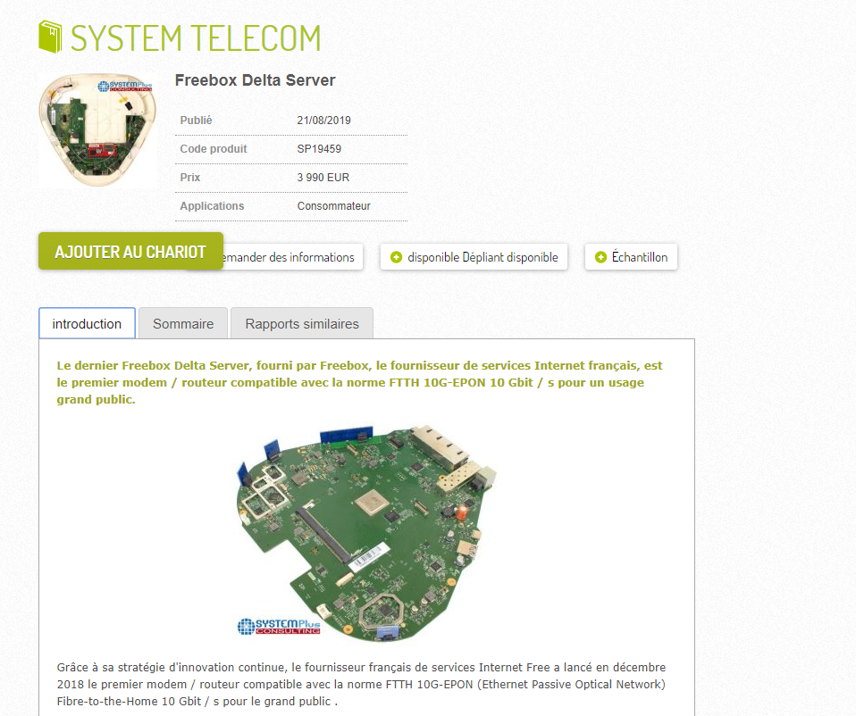 Basée à Nantes, System Plus Consulting est spécialisée dans la technologie et l’analyse des coûts des composants et systèmes électroniques. Sur son site internet, figure pléthore de rapports payants sur divers produits et même… sur la Freebox Delta !