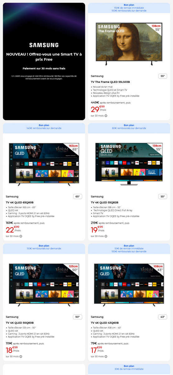 Si vous désirez changer de TV, vous pouvez opter pour la solution lancée par Free en novembre dernier permettant d’acheter un téléviseur connecté Samsung avec un échelonnement du paiement sur trente mois. Si les modèles sont les mêmes proposés depuis un mois, une nouvelle série d’offre de remboursement est désormais disponible et valable jusqu’au 13 mars prochain.