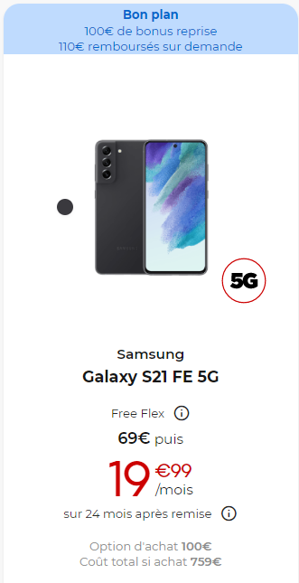 Le second smartphone est le Galaxy S21 FE 5G, qui est disponible avec Free Flex : sur une durée de 24 mois pour ce mobile, le premier paiement sera de 179€ (soit 69€ en déduisant l’ODR) puis 24 loyers suivants de 19.99€/mois. A l’issue des 24 mois, vous avez le choix entre restituer votre mobile ou l’acquérir en versant le montant de l’option d’achat de 100€. Cette offre est valable jusqu’au 22 février.