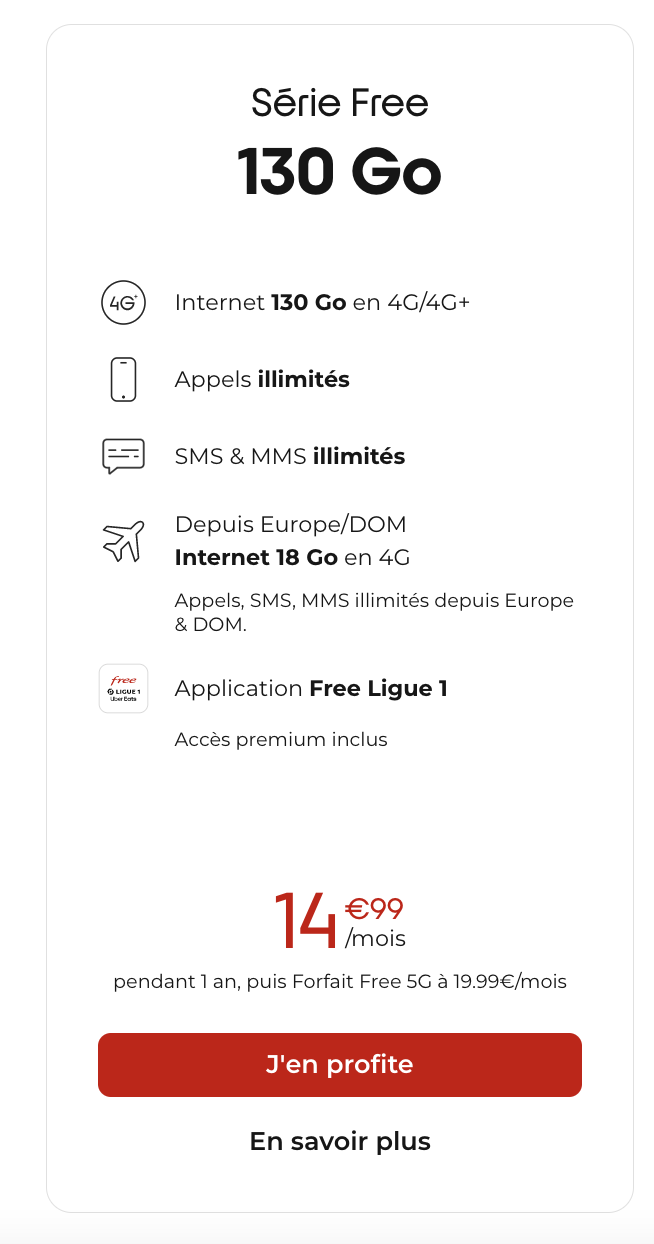 Après avoir figé depuis novembre 2022 son offre Série Free à 110 Go au prix de 14,99€/mois pendant 1 an en supprimant la date limite d’abonnement, Free Mobile enrichit aujourd’hui son forfait. L’opérateur propose désormais 130 Go, toujours au même prix, soit une hausse de 20 Go. Dans le même temps, l’opérateur revoit à la hausse l’enveloppe de données en roaming (Europe/DOM en 4G), laquelle passe de 16 à 18 Go. Les abonnés basculeront après 12 mois automatiquement vers le forfait 5G 210 Go à 19,99€/mois.