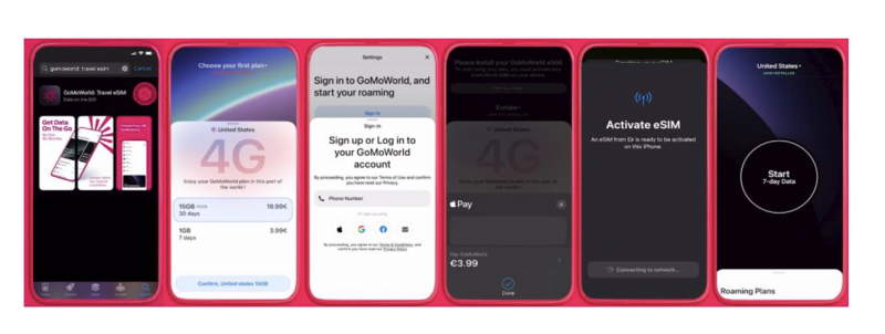 A première vue, l’expérience utilisateur a été placée au cœur du développement du produit pour être simplifiée au maximum. “Il n’est pas nécessaire de signer un contrat, ni de changer de numéro ni bien-sûr d’insérer une nouvelle carte SIM. L’application n’interfère pas avec le forfait mobile habituel de l’utilisateur, qui reste libre de l’utiliser en parallèle”, explique GoMoWorld. Pour profiter de ce service dès maintenant, il suffit de télécharger l’application, de créer son profil, choisir sa destination et finalisez votre paiement.Installez et activez enfin l’eSIM sur votre terminal mobile.