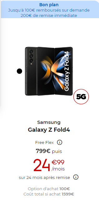 Le premier modèle concerné est le Galaxy Z Fold 4 qui bénéficie d’une remise immédiate de 200€, ainsi que de 100€ d’ODR avec Free Flex.
