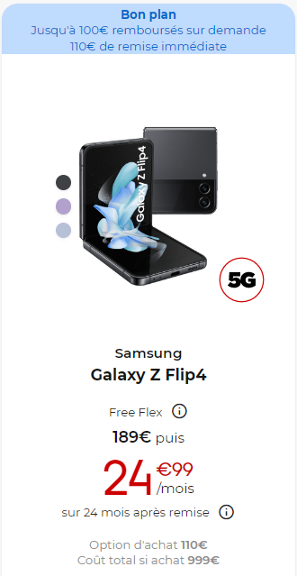 Le premier modèle concerné est le Galaxy Z Flip 4 qui bénéficie d’une remise immédiate de 110€, ainsi que de 100€ d’ODR avec Free Flex.