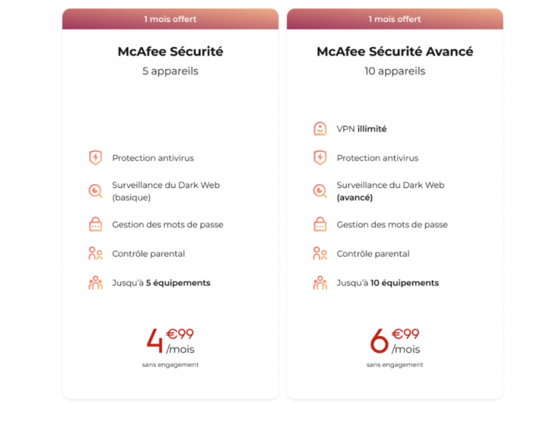 La seconde offre McAfee Sécurité Avancé, davantage premium, est proposée au tarif 6,99€/mois (1er mois offert), sans engagement, pour 10 appareils. Celle-ci a l’avantage de proposer un VPN illimité et de “protéger vos données personnelles et de localisation des regards indiscrets mais aussi d’accéder aux réseaux Wi-Fi publics en toute sécurité avec bande passante illimitée”, précise l’opérateur. La protection antivirus, la surveillance du Dark Web (avancé), la gestion des mots de passe et le contrôle parental sont aussi inclus.