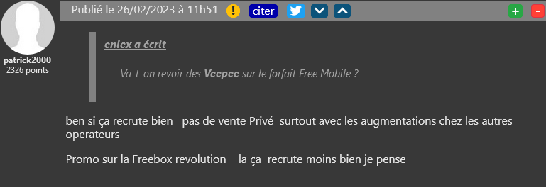 Free lancera ce soir une nouvelle offre sur le site Veepee avec la Freebox Révolution et TV by Canal. L’opérateur se fait rare sur le site d’e-commerce et de nombreux abonnés attendent plus de la part de l’opérateur en ce qui concerne ces offres (un prix plus agressif ou une offre plus innovante…). Les promotions sur les forfaits mobiles sont également réclamées et le choix d’une plateforme tierce est parfois critiqué. Qu’en pensez-vous ?