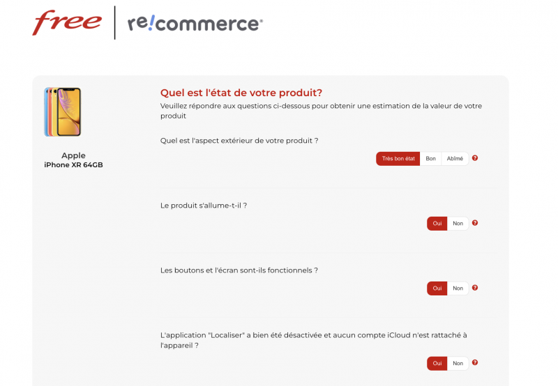 Au total, trois étapes sont à suivre pour la reprise de votre terminal. Tout d’abord, il faudra estimer la valeur de reprise en répondant à 4 questions ( aspect extérieur, le produit s’allume-t-il, boutons et écrans fonctionnels), directement sur cette page dédiée Free x Recommerce, puis envoyer son mobile gratuitement avec une étiquette prépayée avant de recevoir le paiement rapidement par virement bancaire, sous 5 jours après réception du terminal.